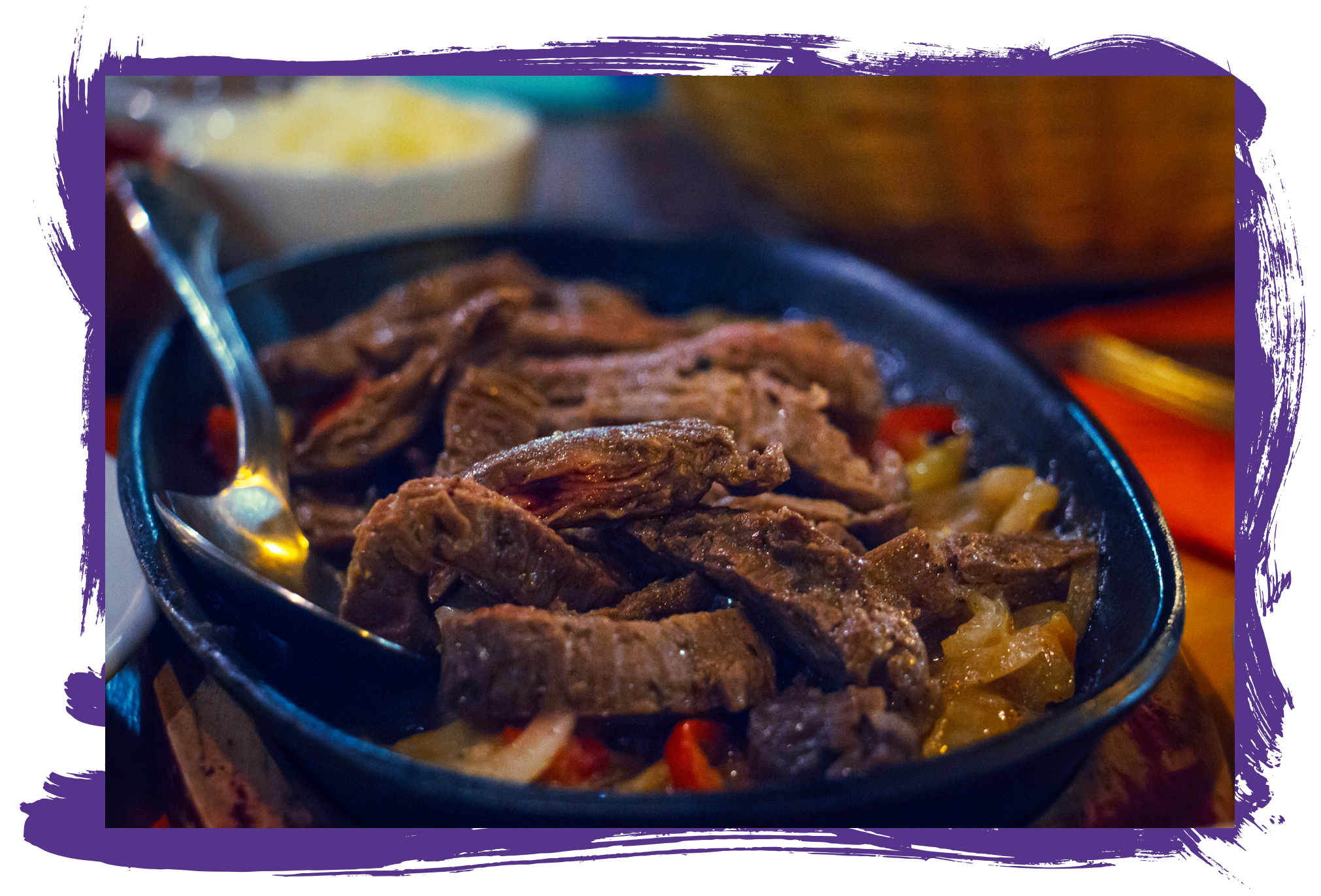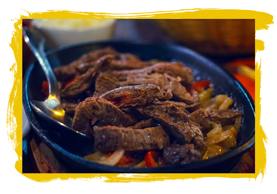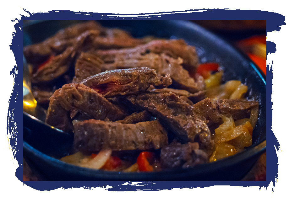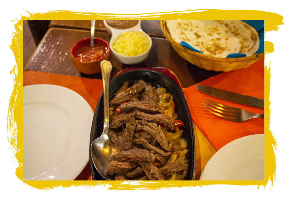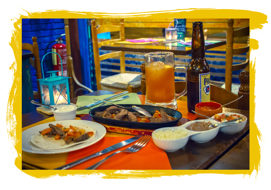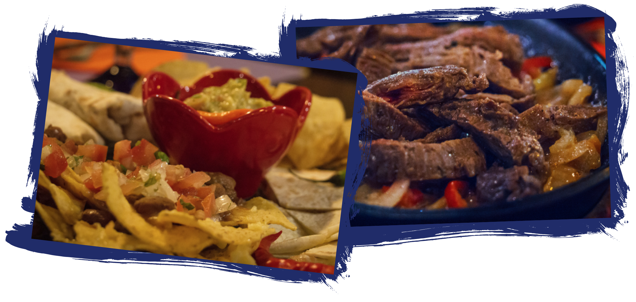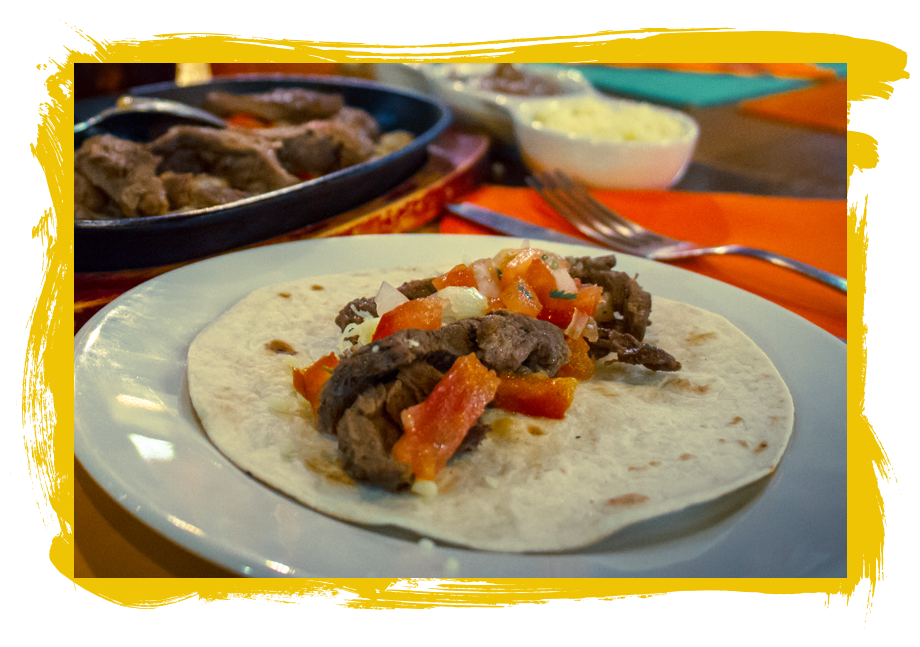 Fajitas de Ternera o Pollo   16,9 200 g de carne de ternera o pechuga de pollo marinadas, cortada en tiritas servido en una plancha caliente sobre una cama de cebollas y pimientos salteados. Viene con cuatro tortillas de harina de trigo y guarniciones para armarse sus tacos.
