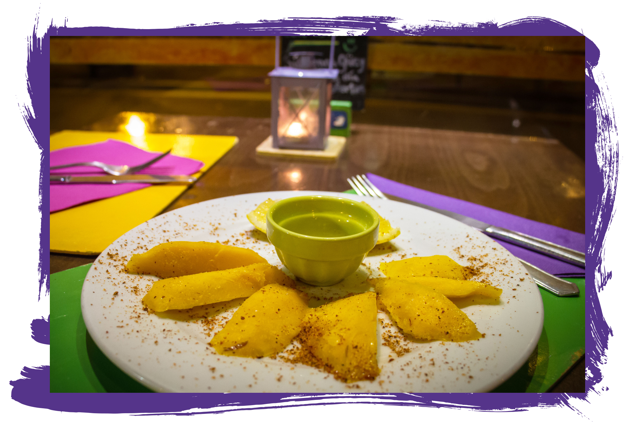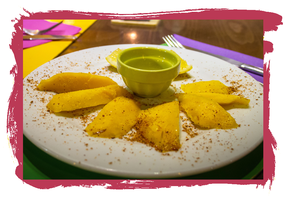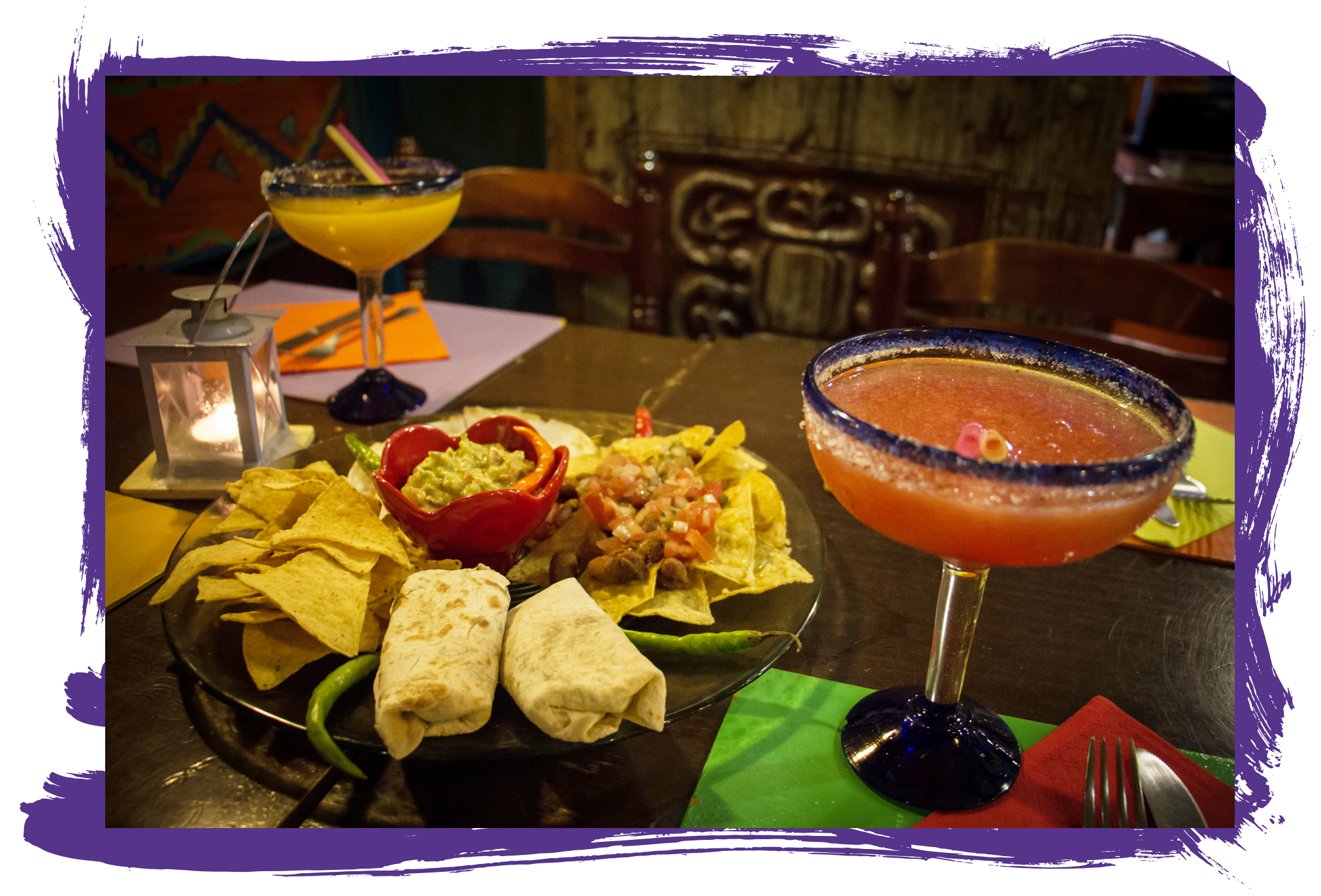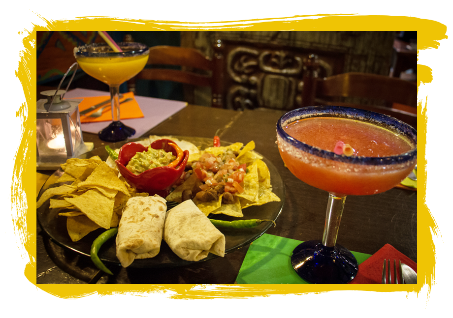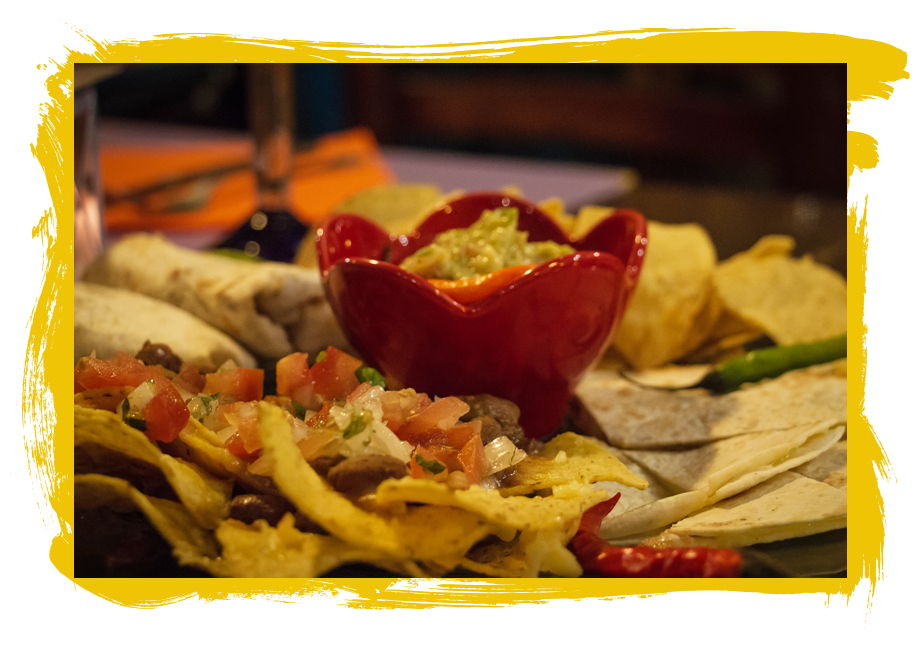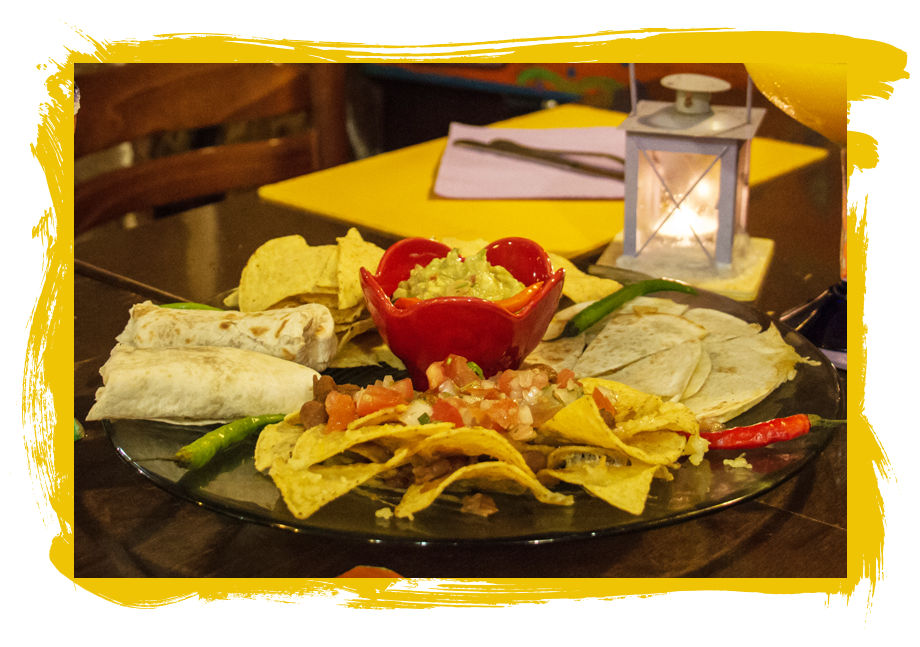 Botana   24,8 Un poco de todo para probar: totopos de maíz con guacamole, nachos, quesadilla y dos burritos pequeños.