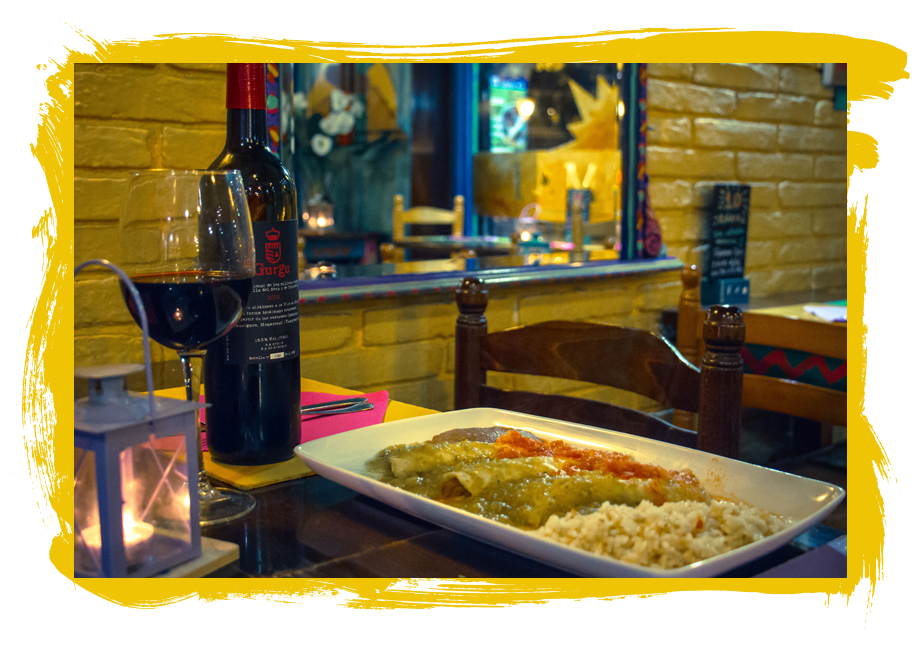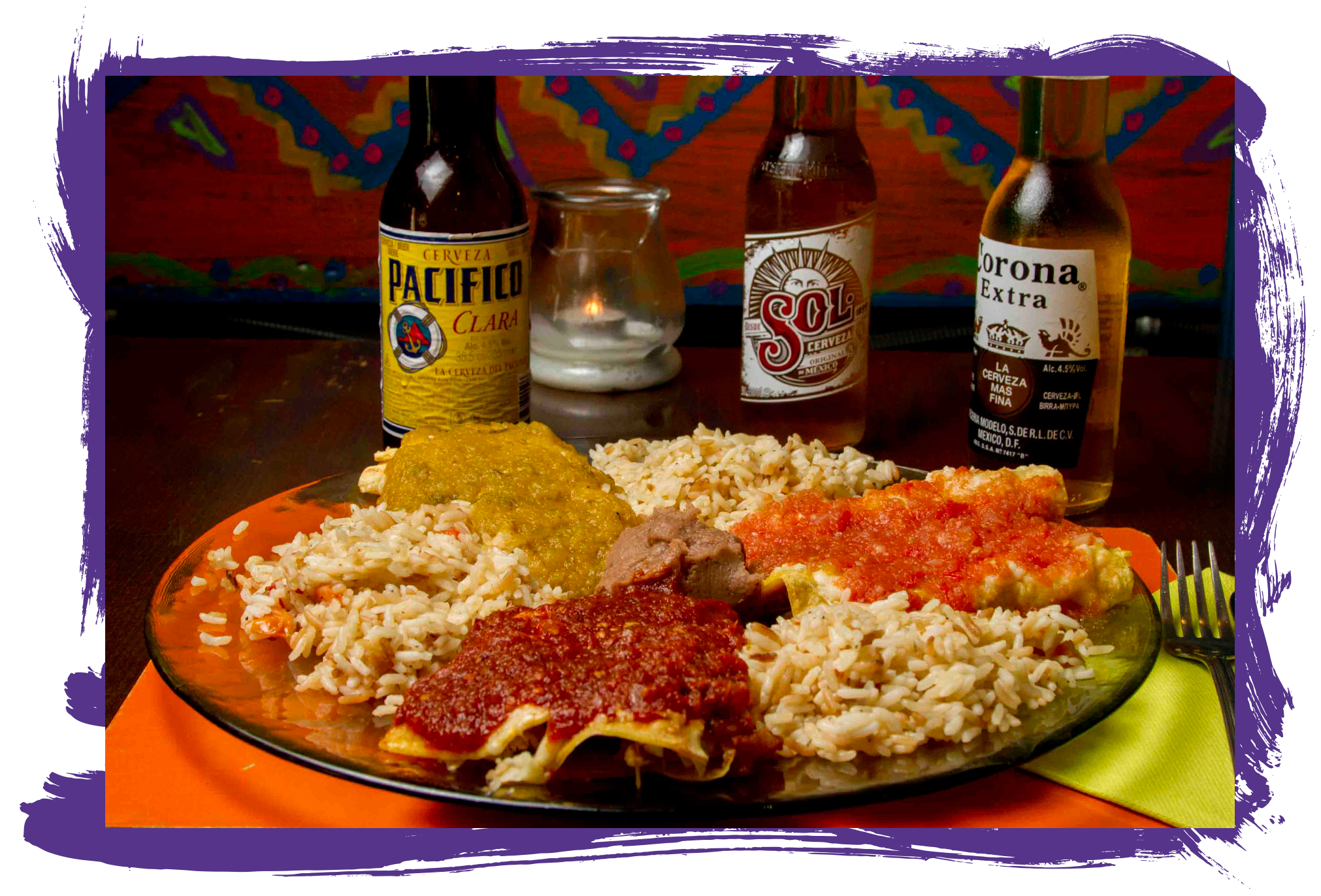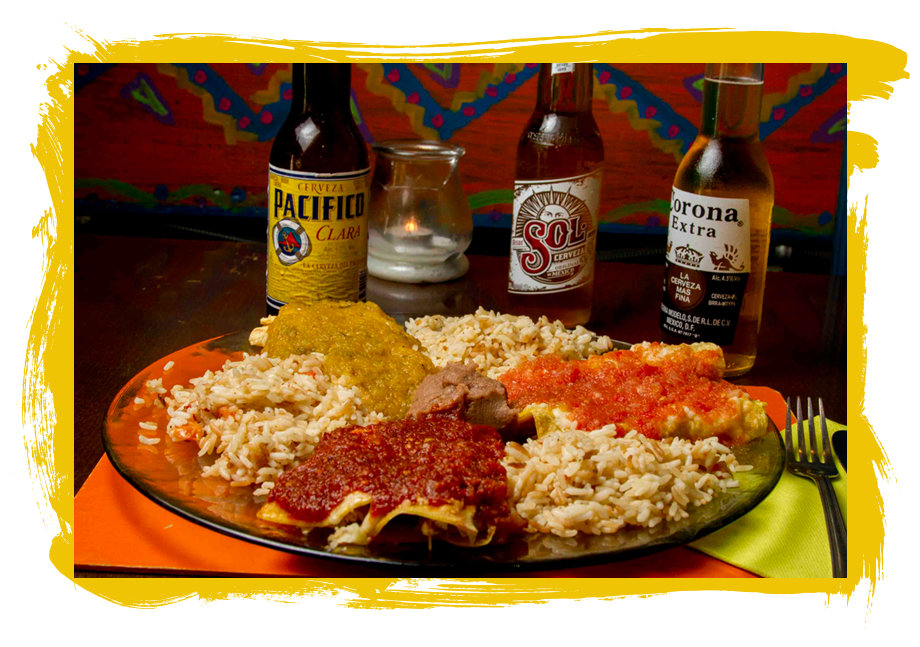 Enchiladas con Salsa Roja, Verde o Chipotle v 13,5 Tres tortillas de harina de maíz enrolladas y rellenas con carne de su elección, encima queso gratinado y salsa roja, verde o chipotle. Acompañado de arroz mexicano y frijoles refritos.