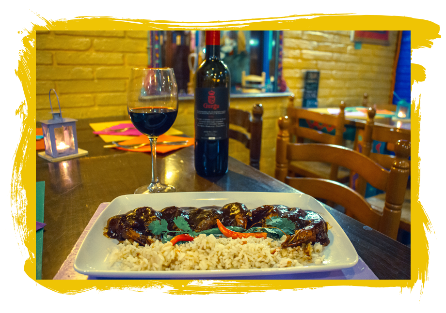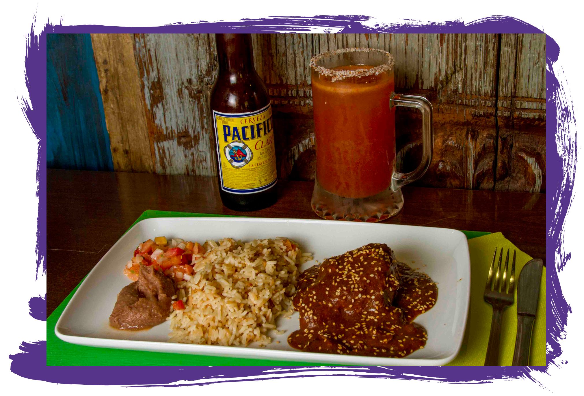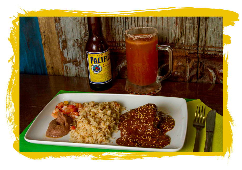 Pollo al Mole   14,8 El Mole es una típica salsa mexicana elaborada con más de 40 ingredientes diferentes. La pechuga de pollo de 200 g es cocida lentamente en el mole; servida con arroz mexicano y frijoles refritos.