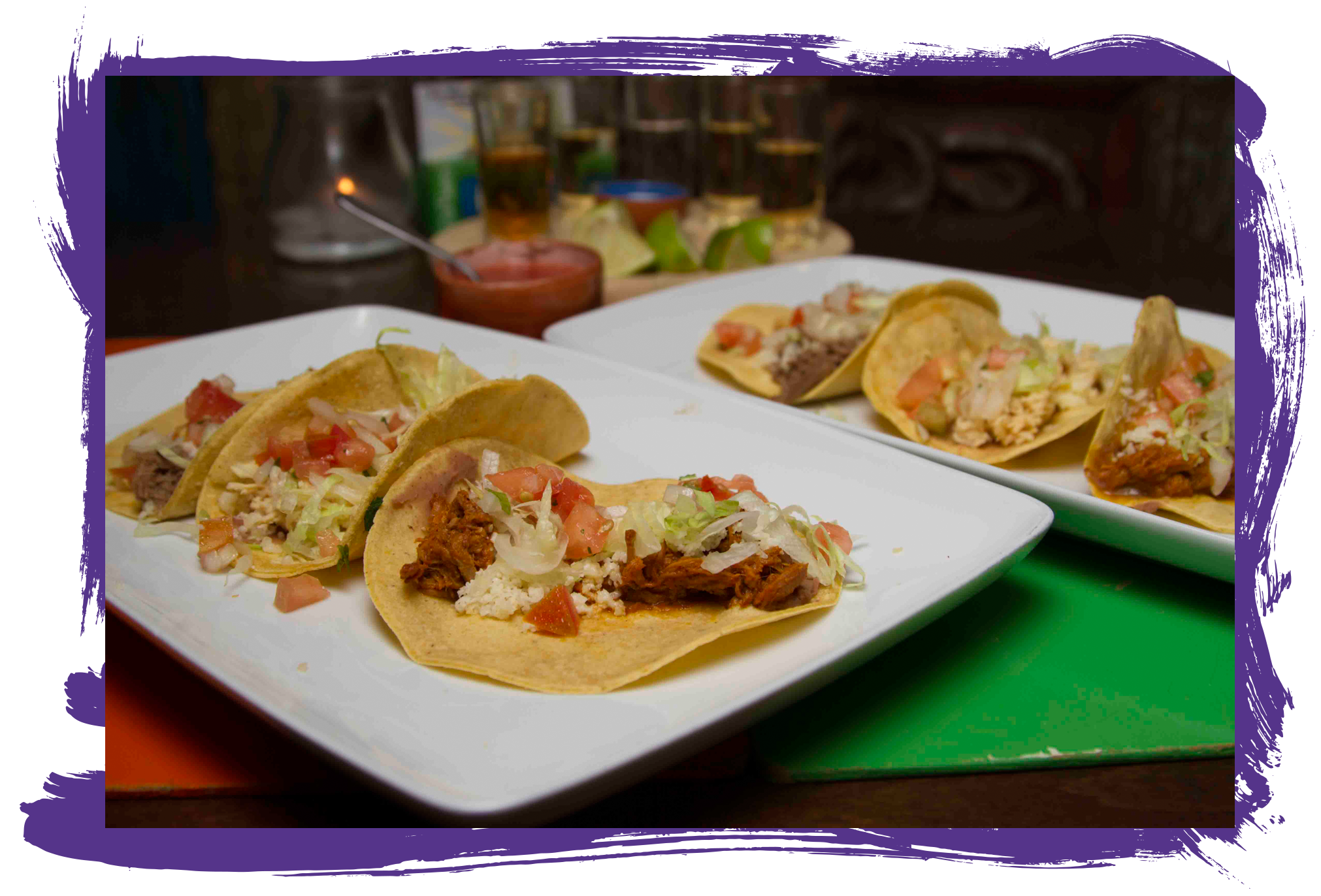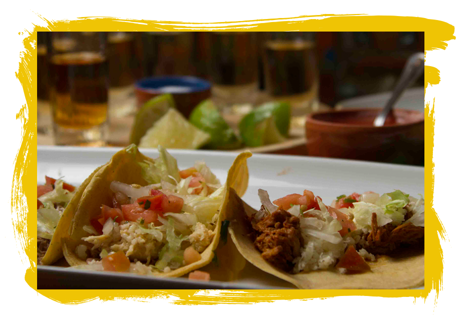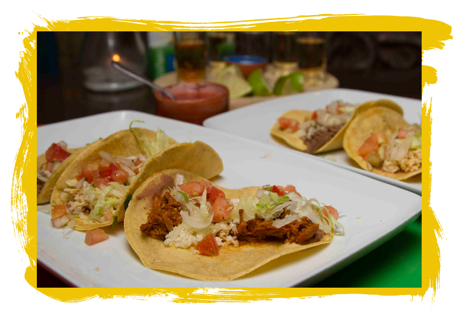 Taco Fiesta   14,5 Tres variedades de carne: pollo, ternera y cochinita pibil. Vienen con cuatro tortillas de harina de maíz, pico de gallo, queso, frijoles refritos y arroz mexicano.
