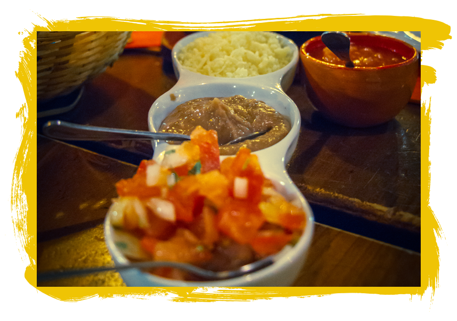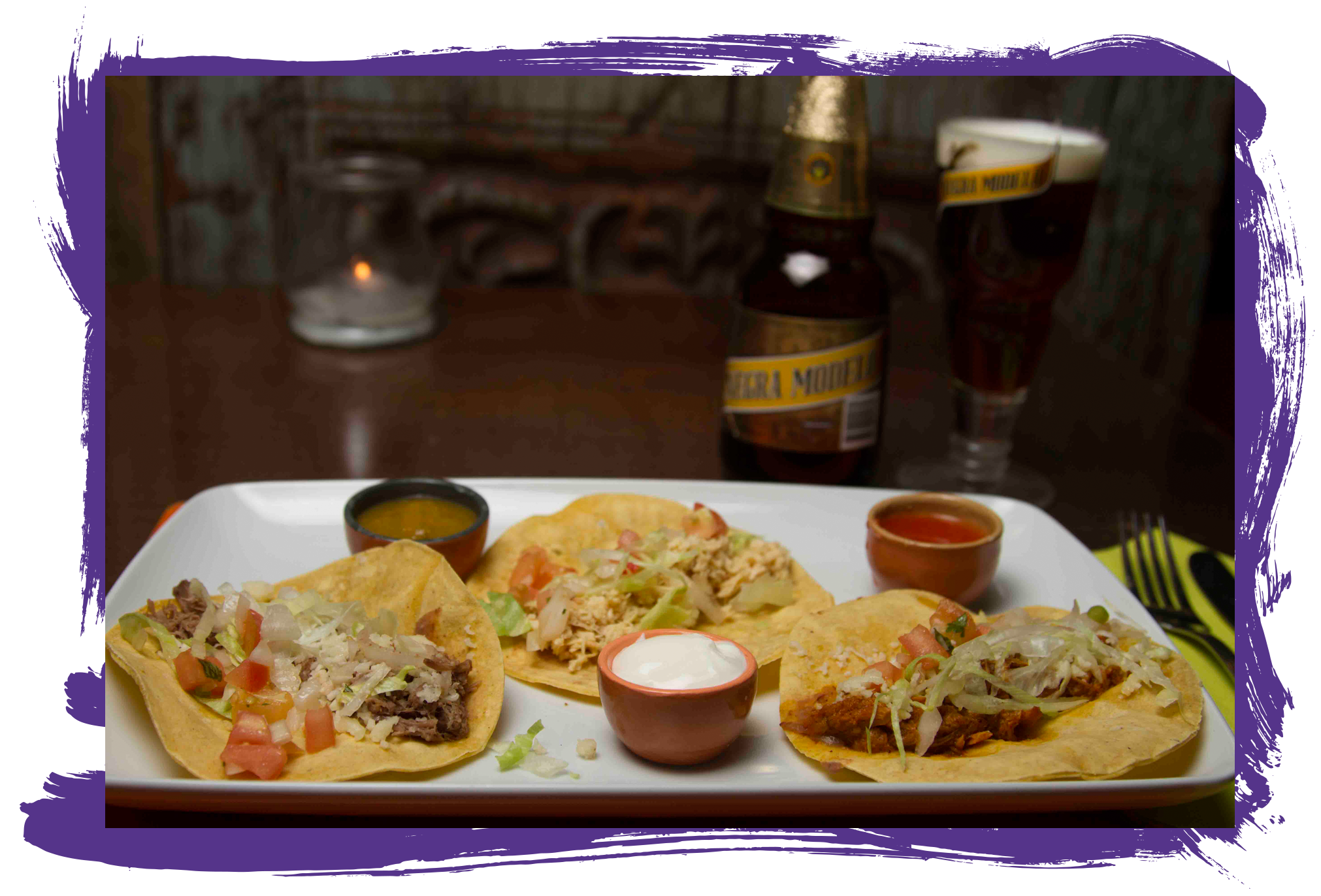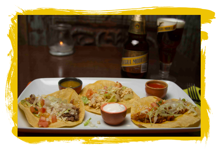 Tacos   10,9 Tres tortillas de harina de maíz con pico de gallo, queso, lechuga, frijoles refritos y carne.