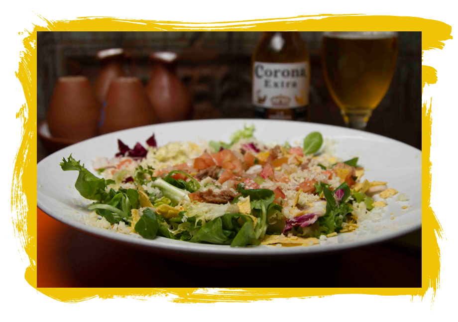 Taco Salad   9,5 Ensalada de lechuga fresca con ternera picada salteada con especias, queso rallado, pico de gallo y chips de maíz picados.
